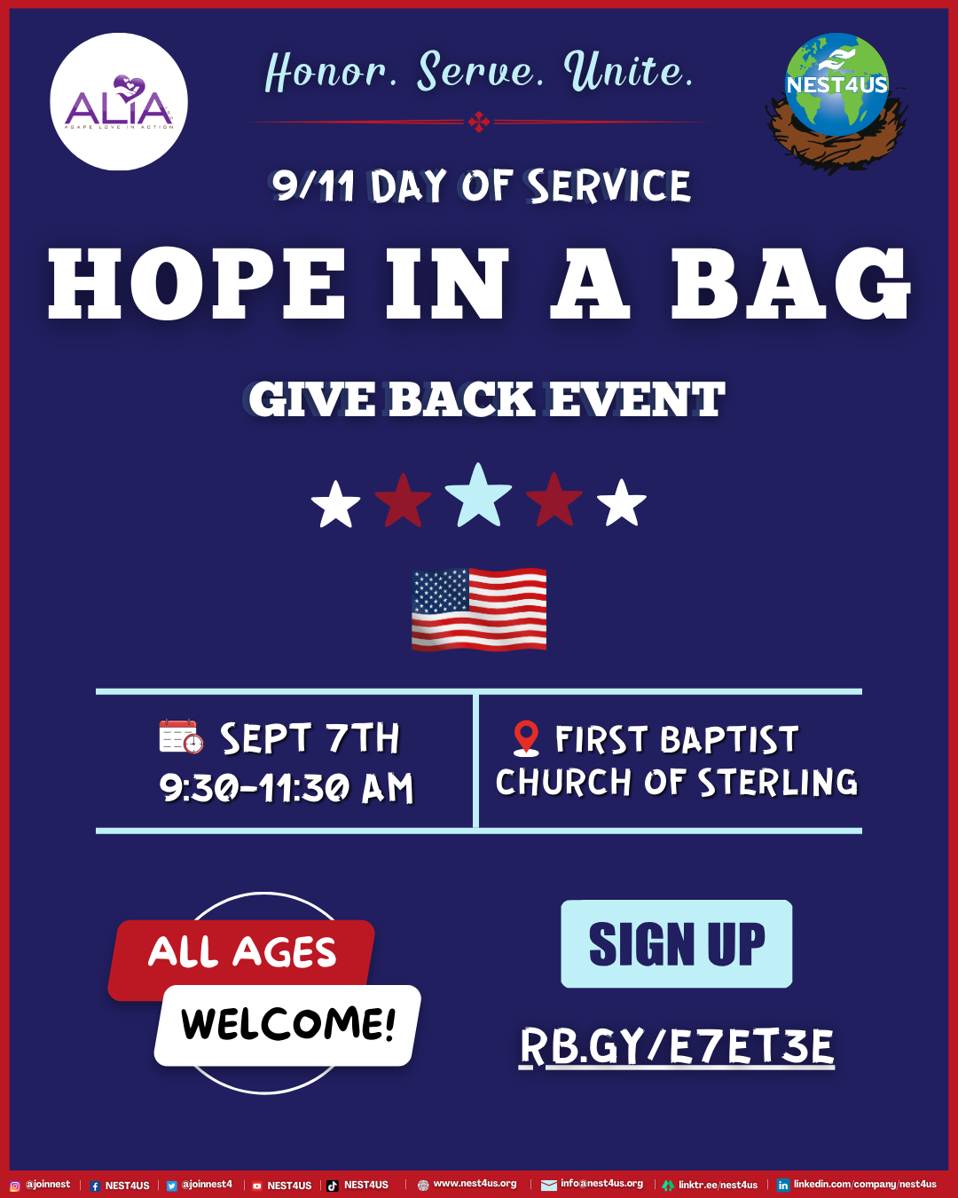 Join us for our 9/11 Day of Service event to honor & benefit veterans, community heroes, & families in need. Help us pack thousands of bag-together let's provide love & hope to those in need!