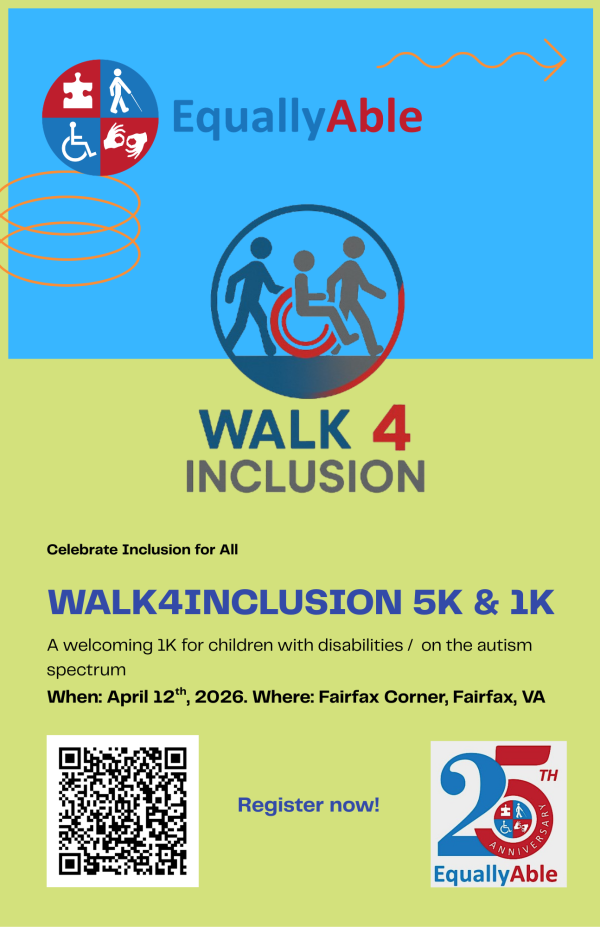 EquallyAble's Walk4Inclusion 2026, taking place this Sunday, April 12 at Fairfax Corner (11895 Grand Commons Ave, Fairfax, VA 22030).